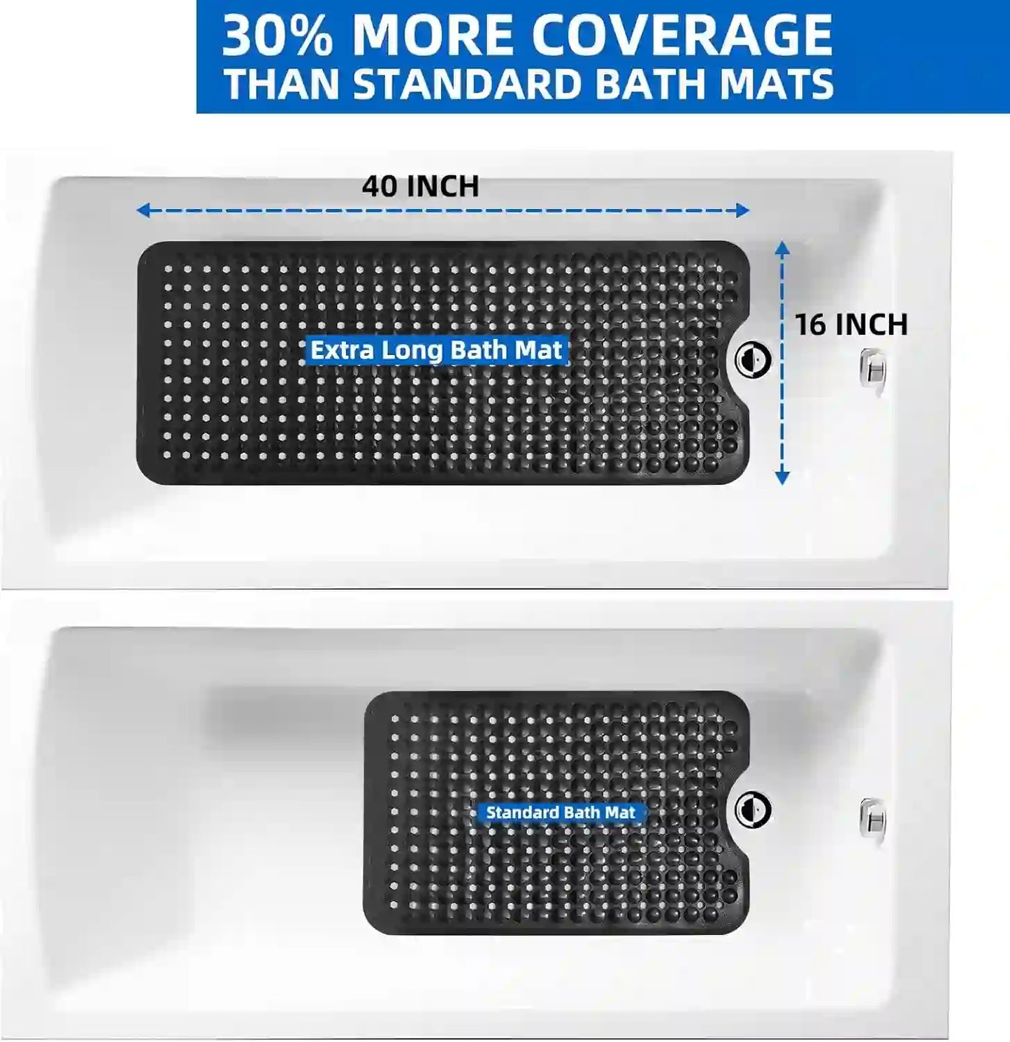 - EXTRA LARGE SIZE: Our oversized mat is 40 inch x 16 inch and is 30% longer than standard bath mats for maximum coverage. Excellent drainage system consists of 278 oversized drainage holes to ensure water flow and reduce surface water. Use this bathtub mat on your tub or shower floor to enjoy a healthier and better life.